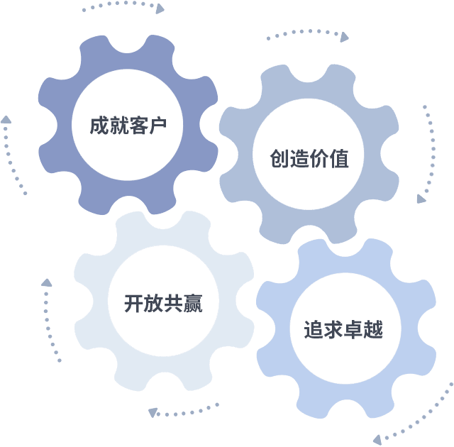 成就客户是一切决策的出发点,,,创造价值是衡量所有工作的标准,,,,追求卓越是我们做事做人的态度,,开放共赢是我们的格局也是最终的结果。。价值观的齿轮环环相扣,,,,推动着组织里的每个人不断向前。。