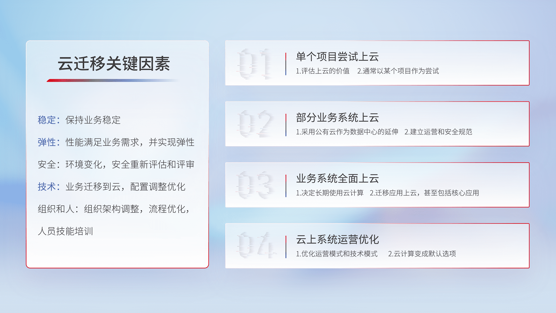 结合实际业务,,,,从规划设计、、、云平台选型、、、云原生改造、、、数据迁移、、、集成交付,,迁移全过程为客户识别最佳上云路径,,,,做好风险识别管理,,,设计网络架构、、身份权限、、安全审计合规、、、操作审计、、日志审计、、监控告警策略、、多站点容灾设计等,,,对云上基础设施进行整体规划,,提升IT治理水平,,,,以满足弹性、、高可用、、、高性能的需求。。。