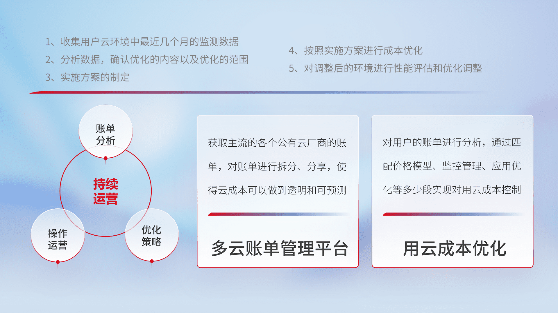 通过多云纳管,,以统一的资源数据模型把客户的云资源进行抽象和封装,,,,进而实现对多云资源的统一操作,,保障云资源管理的可靠性、、、稳定性与可用性。。。量身定制化运维内容,,配置、、、开发运维、、、、补丁管理、、、备份、、监控、、、、认证和访问管理、、审计和日常巡检等,,,保障在用云过程中的可靠度,,,,稳定度以及高可用率。。。